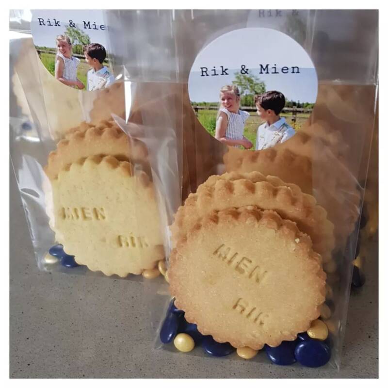 Koekjes met jouw naam en/of een leuk figuurtje erbij. Pak ik ze in of pakken jullie zelf in?