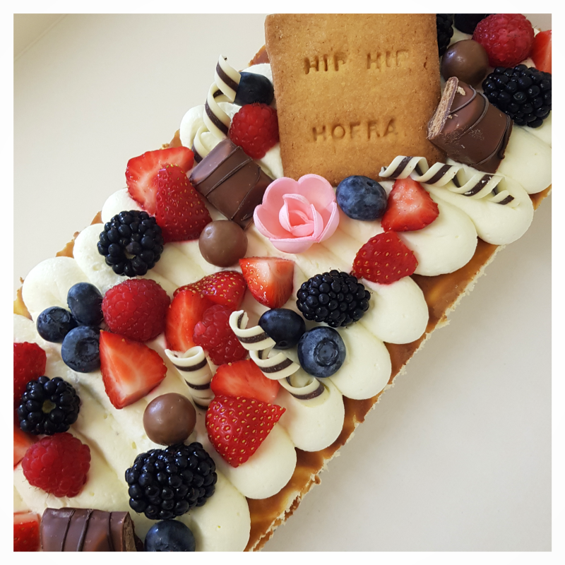 Lettertaart is een luchtige biscuitdeeg, heerlijke vulling afgewerkt met vers fruit en koekjes.